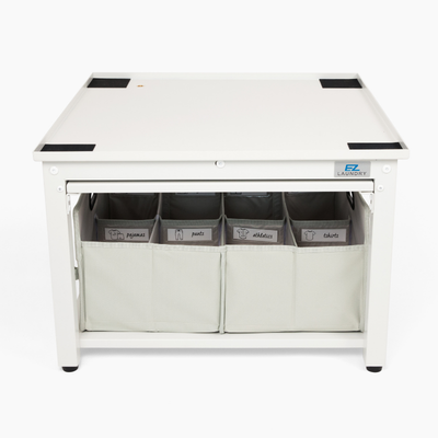 The glide-out shelf holds your basket at standing height for easy unloading and folding. Add Fold & Stow to organize piles as you go—no back-and-forth. Elevate your comfort with this simple yet transformative addition to your laundry routine.