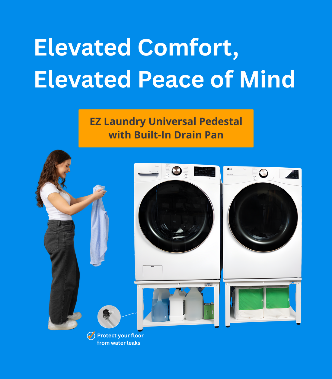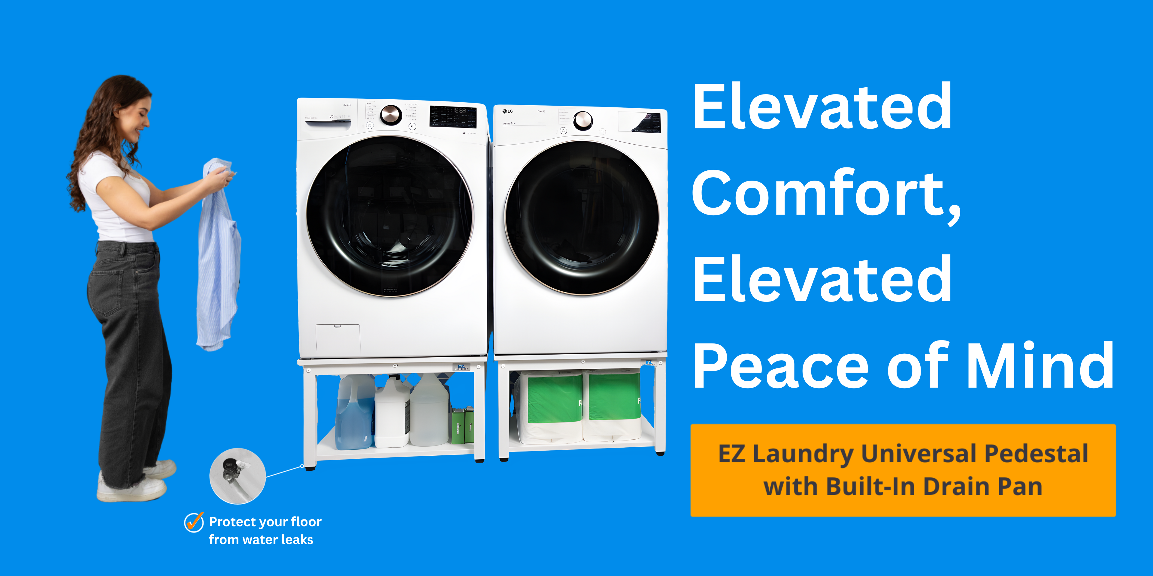 EZ Laundry integrates a built-in drain pan with hose to route drips safely—while lifting your washer for back-friendly loading and giving you storage that actually gets used.